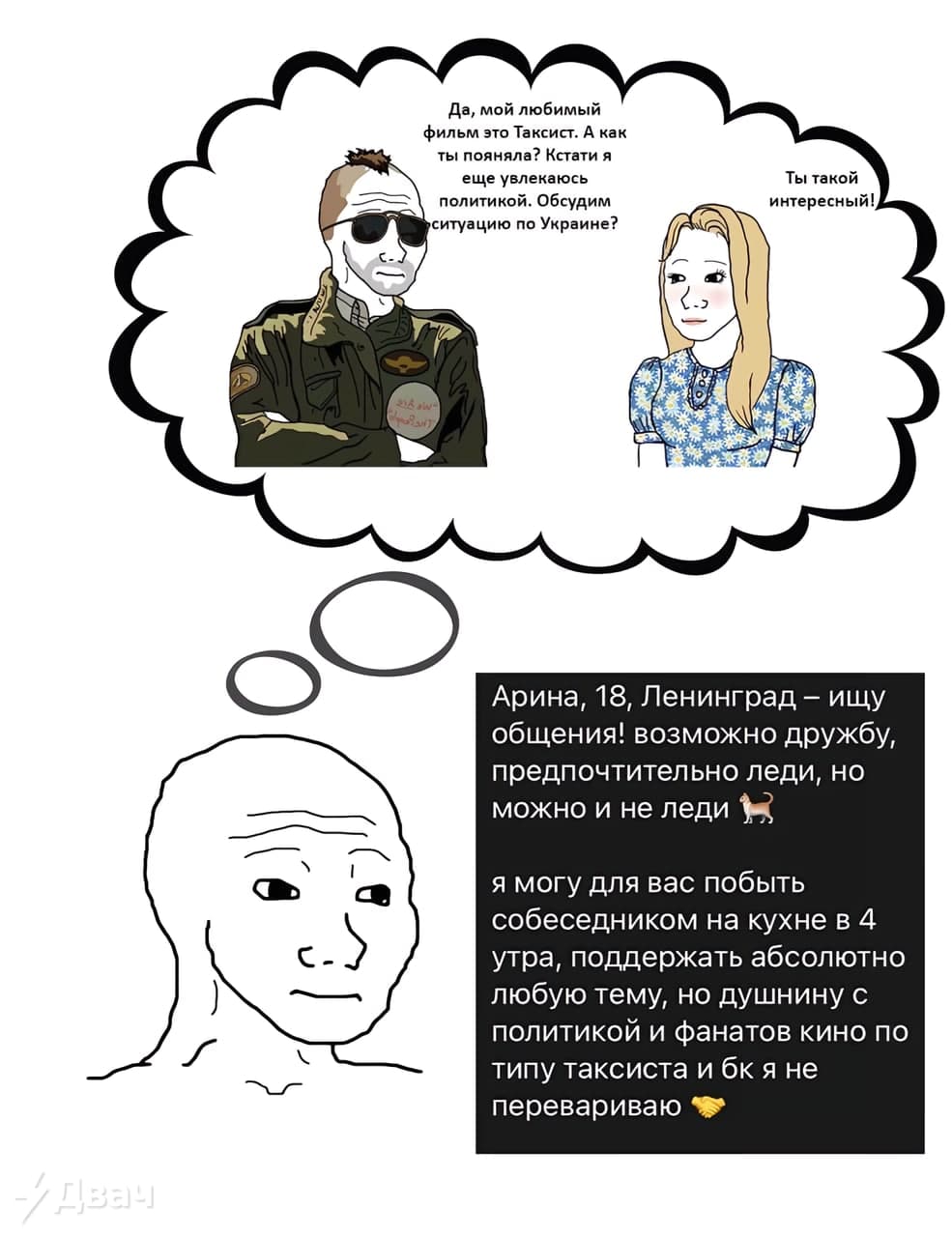 >>61326750 Вполне реально добиться девушки с экрана. Просто количество усилий, которое тебе нужно будет приложить колоссально. Тебе придется каждый день очень много лет тяжело работать ради этого во всех смыслах. Придется прибегнуть ко многим жертвам. Обычный средний человек на такие жертвы не готов. Фантазия обычного среднего человека - это что ему с неба счастье само упадет. >Хм, почему нет? Если он сознательно выбрал путь фантазий, то он должен говорить об этом смело, открыто и прямо в лицо своему брату: ДА Я ЛЮБЛЮ АЙКАРЛИ! ДРОЧУ НА НЕЁ КАЖДЫЙ ДЕНЬ! ОНА ТОТ ОБРАЗ ДЕВУШКИ, КОТОРЫЙ МНЕ ПОДНИМАЕТ НАСТРОЕНИЕ КАЖДЫЙ ДЕНЬ! ХОЧУ НАЙТИ ДЕВУШКУ КАК ОНА, ПОТОМУ ЧТО ЗНАЮ, ЧТО ОНА МНЕ НЕДОСТУПНА - это то, как поступит настоящий Мужчина. Если же он полностью отказался от реальных девушек, то он точно так же должен смело об этом говорить. И не стесняться. Потому что это основа самоуважения.