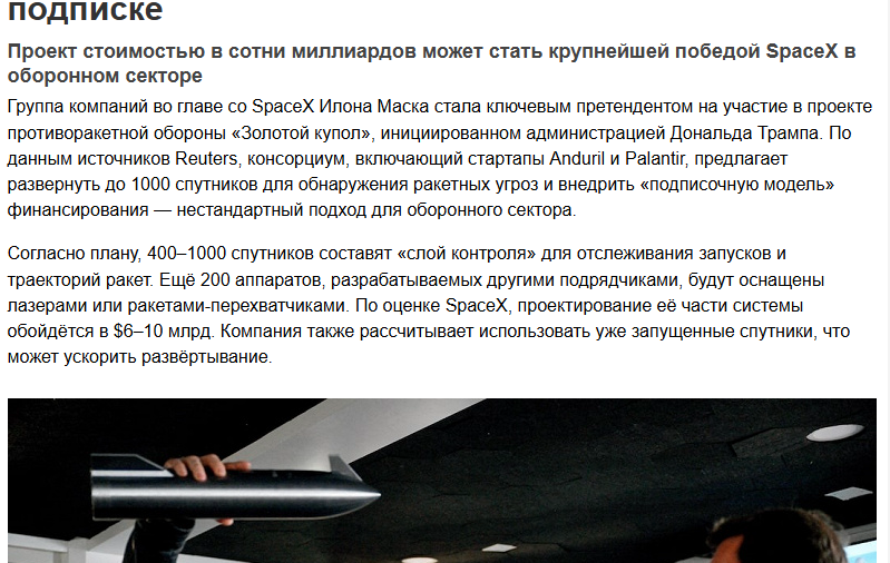 Defense One (18.04.2025) пишет, что в то время как оборонные подрядчики ждут твердых указаний от Пентагона по «Золотому куполу», руководители говорят, что уже существует технология, позволяющая начать разработку космических перехватчиков, способных поражать ракеты на этапе разгона, но признают, что это непростая задача.