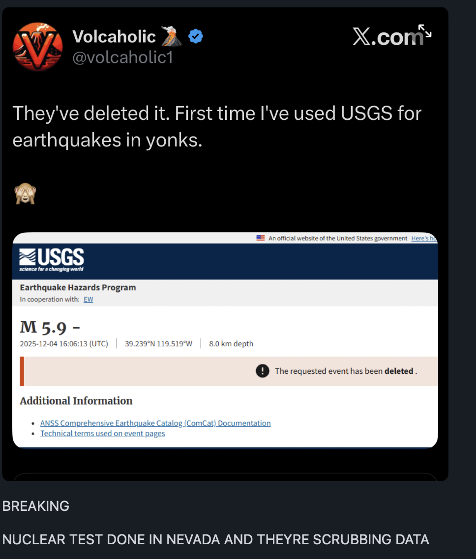 >>61352810 Потому что запад США это одна большая сейсмоактивная зона. Да и где конкретно в Неваде это зафиксировали? Округ какой? И конкретную ссылку на географическую службу США с конкретными показателями предъяви, а не пост какого-то долбоёба из Сриттора, который утверждает, что инфу с их сайта удалили и у него правда. У швитых пендосов ничего такого без анонсов не проходит, хотя бы потому, что на этот полигон до сих пор экскурсии возят. И ещё раз почему ни слова об этом в пиндосских новостях? Почему по каналу KLAS, что в Вегасе никто сейчас не ведёт спецвыпуск