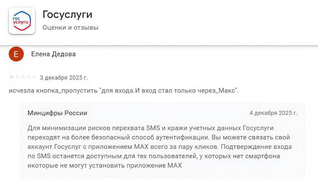 Судя по ответу разработчика в Google Play, это не баг, а фича: чтобы снизить риск перехвата SMS и кражи учётных данных, «Госуслуги» перевели подтверждение входа в Max, который называют «более безопасным» способом.