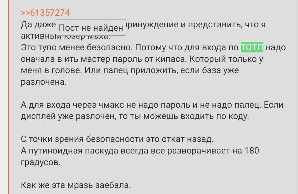 >>61357274 Да даже если забить на принуждение и представить, что я активный юзер маха. Это тупо менее безопасно. Потому что для входа по ТОТП надо сначала в ить мастер пароль от кипаса. Который только у меня в голове. Или палец приложить, если база уже разлочена.