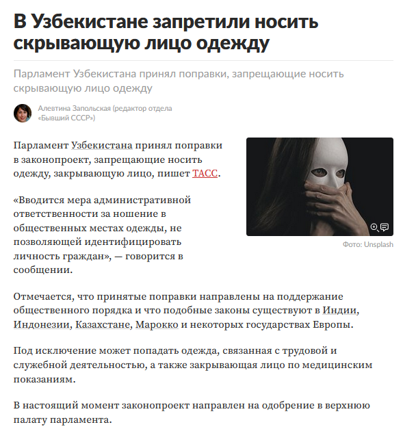 > В Узбекистане начали штрафовать мужчин за густые бороды, извещает Верховный суд республики. Основание — поправка в АК «Нахождение в общественных местах с закрытым лицом в степени, не позволяющей идентифицировать личность». Штраф — от 3,4 миллиона до 5,1 миллиона сумов.