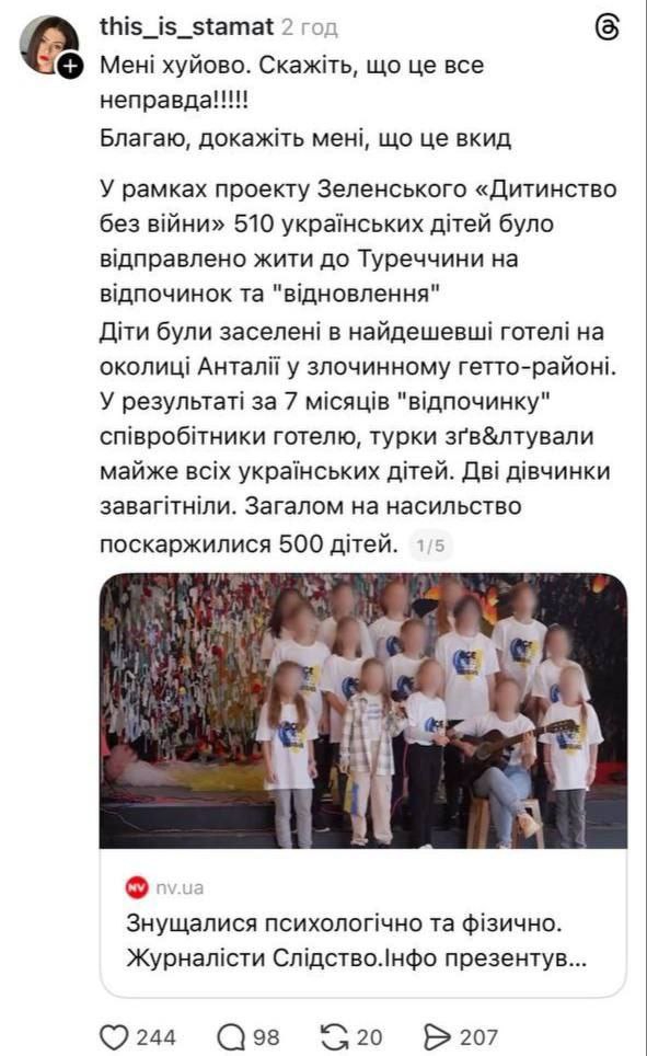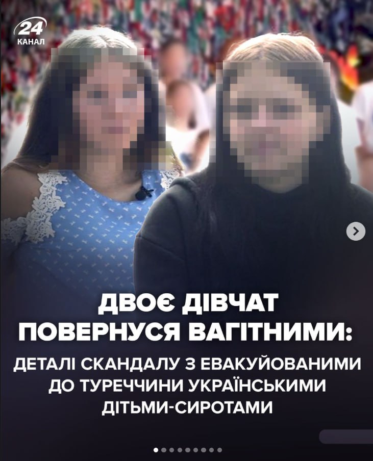 Слiдство.Iнфо. Две девочки-подростка из украинских приютов, которых эвакуировали в Турцию, родили от сотрудников отелей. Более 500 вывезенных с Украины в Турцию детей подвергали насилию. Речь о сиротах из Днепропетровской области, которых вывозили из страны в рамках проекта «Детство без войны». На данный момент проект закрыт. Журналисты ознакомились с отчётом, в котором были собраны жалобы вывезенных в Турцию детей. Самое скандальное заявление касается беременности несовершеннолетних.