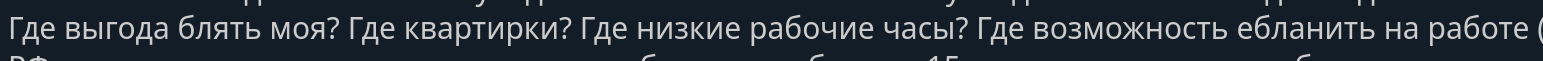 >>61415837 > Где выгода блять моя? Где квартирки? Где низкие рабочие часы? Где возможность ебланить на работе