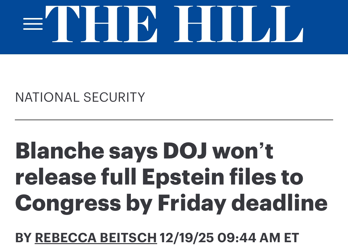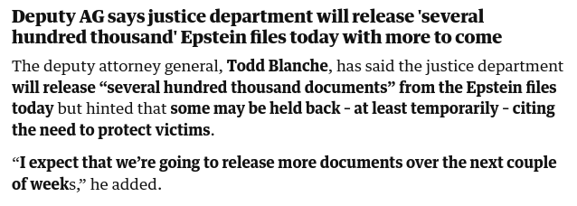 > Департамент юстиции сегодня опубликует несколько сотен тысяч файлов > Но это не все файлы > Необходимо время, чтобы обеспечить анонимность жертв > Остальные файлы будут публиковаться в течение 2-3 недель > у конгресса в данный момент нет механизма для обеспечения соблюдения крайнего срока или привлечения администрации Трампа к ответственности, если крайний срок не соблюдается или если законодатели утверждают, что некоторые цензурные правки являются незаконными.