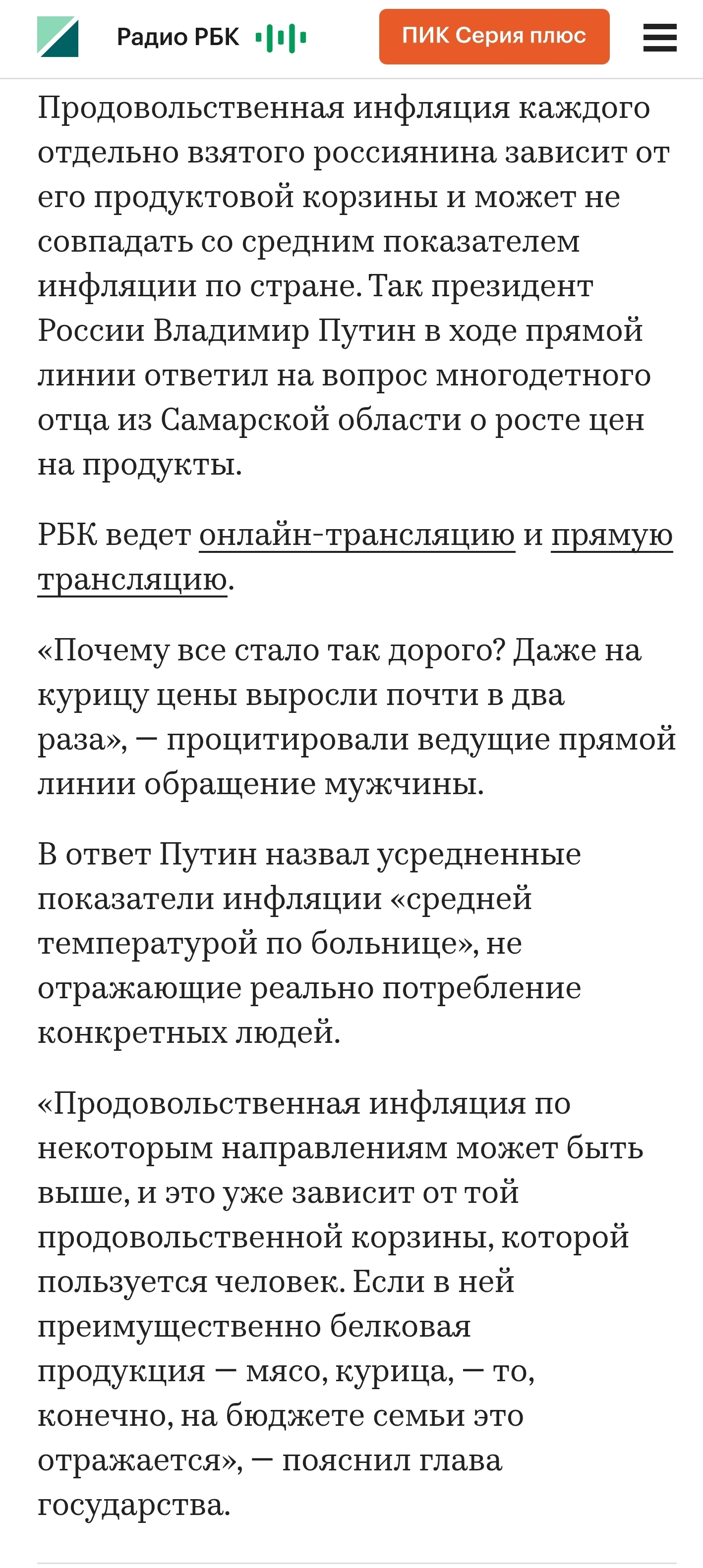 >«Продовольственная инфляция по некоторым направлениям может быть выше, и это уже зависит от той продовольственной корзины, которой пользуется человек. Если в ней преимущественно белковая продукция — мясо, курица, — то, конечно, на бюджете семьи это отражается», — пояснил глава государства.