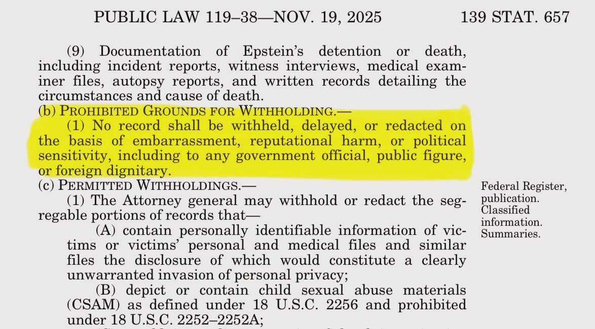 >>61448154 (OP) В пятницу 30-дневный срок для публикации документов истек. Он был установлен «Актом о прозрачности файлов Эпштейна» (Epstein Files Transparency Act), который приняли обе палаты Конгресса и подписал президент Дональд Трамп еще в ноябре. Однако заместитель генпрокурора Тодд Бланш заявил, что Минюст не опубликует все документы сразу: «сегодня — несколько сотен тысяч, а затем в течение следующих нескольких недель — еще несколько сотен тысяч». По его словам, над публикацией работали 187 юристов ведомства.