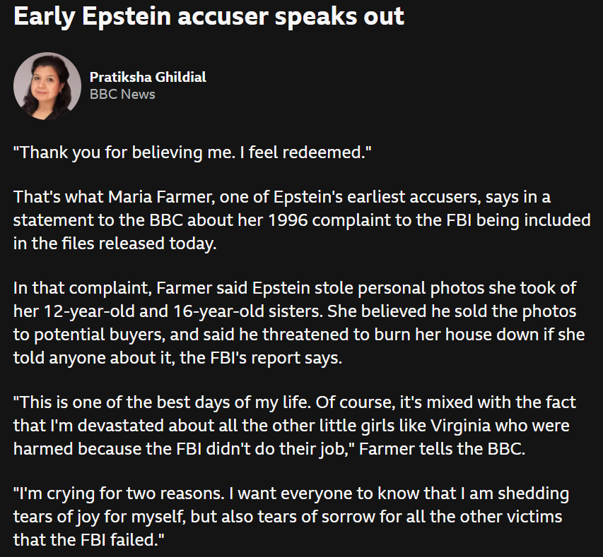 >>61448154 (OP) > Эпштейн привёл 14-летнюю девушку к Трампу в Мар-а-Лаго, сказав: «Это толковая девчушка, правда?» – Трамп кивнул в знак согласия