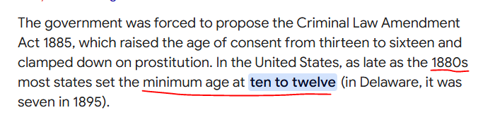 >>61450256 В Древнем Риме для девушек было принято выходить замуж и иметь детей вскоре после наступления половой зрелости. Согласно римскому праву, невеста должна была достичь по крайней мере 12 лет. На первые браки для невест в возрасте от 12 до 24 лет требовалось согласие невесты и её отца. В конце античного периода римское право разрешает женщинам старше 25 выходить замуж без согласия родителей Католическое каноническое право следовало римскому праву, но в XII веке церковь резко изменила правовые нормы касательно брачного согласия и позволила девушкам старше 12 лет и парням старше 14 лет обручаться без одобрения родителей, в том числе тайно[4] В средневековой Англии брачный возраст можно рассматривать как переменную, зависящую от экономических обстоятельств. После Чёрной смерти, когда наблюдался дефицит рабочих[11], налицо, что бракосочетание подростков в Англии не было нормой[12]. В средневековой восточной Европе патрилокальность[англ.]* славянских традиций задерживала ранние и универсальные браки (как правило, невесты в возрасте 12—15 лет, с менархе в среднем в 14 лет) Первый письменный закон о возрасте упоминается 800 лет назад. В 1275 году в Англии, в рамках закона об изнасиловании, в статуте Вестминстер 1 названо преступлением похищение «девы, не достигшей возраста» (англ. maiden within age), с её согласия или без него. Выражение «не достигшей возраста» (англ. within age) истолкована юристом Эдвардом Коуком в смысле не достигшей возраста вступления в брак, который в то время был 12 лет[15]. В XII веке юрист Грациан, основатель канонического права в средневековой Европе, устанавливал возраст половой зрелости для брака между 12 и 14 годами, но соглашение на вступление в брак могло быть заключено для детей старше 7 лет. Авторитетные источники утверждают, что согласие на брак могло даваться и в более раннем возрасте; оно было действительным при условии, что ни одна из сторон не расторгнет брачное соглашение до достижения половой зрелости или не вступит в брачные отношения Американские колонии следовали английский традиции, но закон был не более чем ориентиром. Например, Мэри Хэтэуэй (Вирджиния, 1689) было только 9 лет, когда она вышла замуж за Уильяма Уильямса. Сэр Эдвард Кокс (Англия, XVII век) прояснил ситуацию: «брак девочек в возрасте до 12 лет считался нормой, и возраст, в котором девушка, которая была женой и имела право на часть наследства от имущества её мужа, был 9 лет, хотя её мужу было всего четыре года»