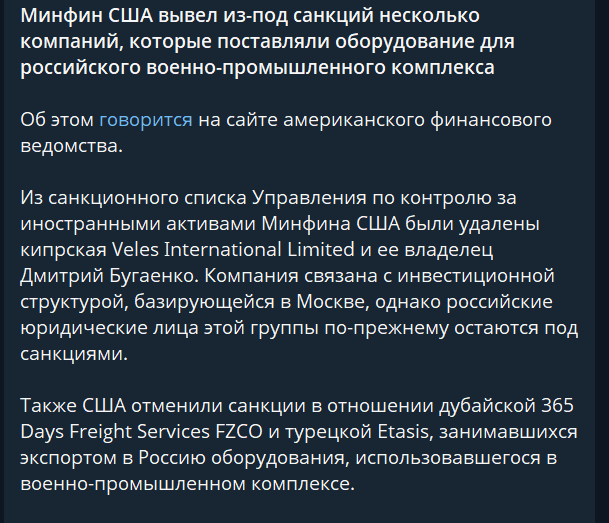 Из санкционного списка Управления по контролю за иностранными активами Минфина США были удалены кипрская Veles International Limited и ее владелец Дмитрий Бугаенко. Компания связана с инвестиционной структурой, базирующейся в Москве, однако российские юридические лица этой группы по-прежнему остаются под санкциями.