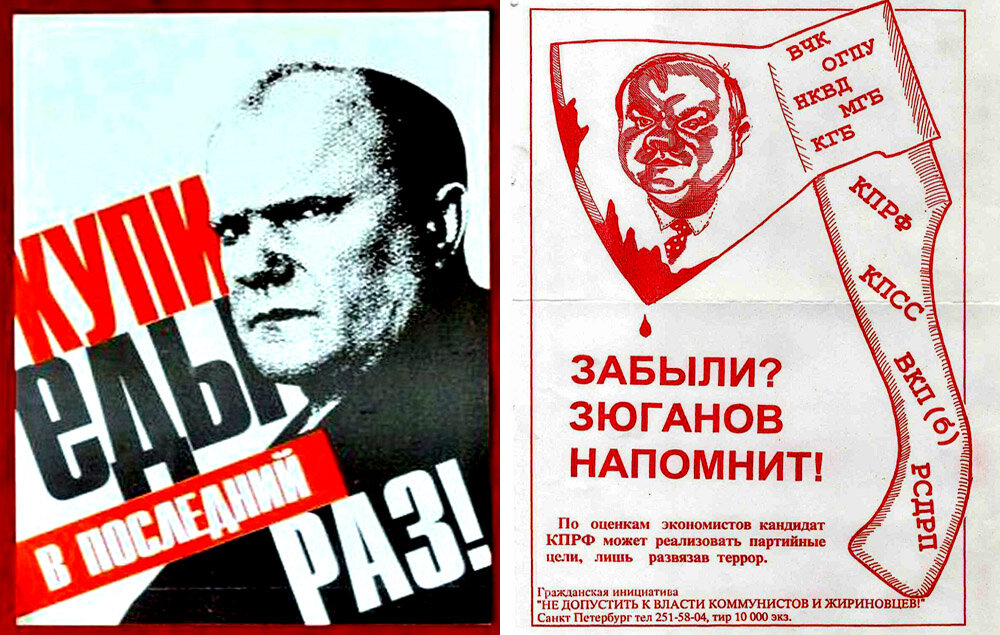 Слева - фото Зюганова, справа - Гайдара, хотя тот к КПРФ отношения не имел и заодно с дядей Зю они никогда не были (или были?). В чём смысл этой антирекламы, кто из олдов объяснит?