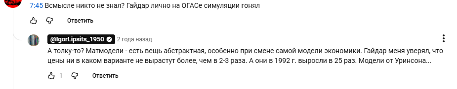 >>61484432 Ну говорят, что Гайдар прогнал свои реформы на ОГАСе и он показал, что в их результате в рыночек не впишутся 30 лямов и он такой ну ок, проводим реформы. Результаты оказались близкие к расчетам ОГАСа