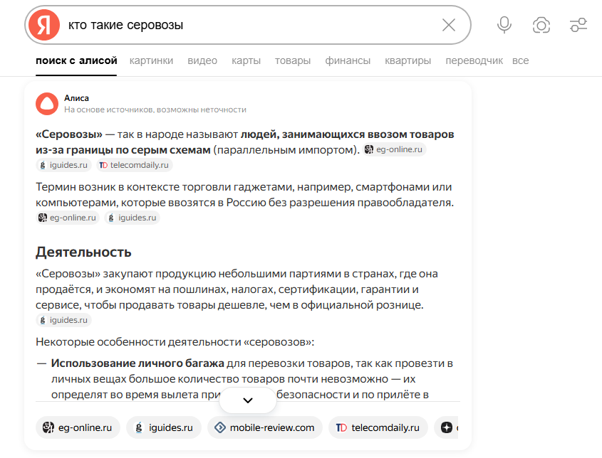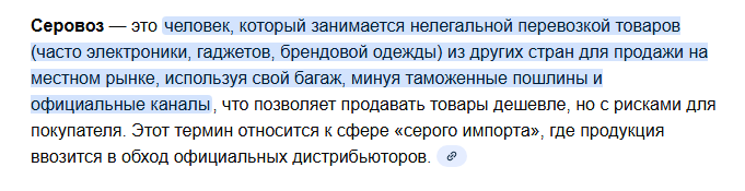Мнение нейронки гугла, идиот. Еще раз, выучи ты уже разницу между теми, кто возит без разрешения официального производителя и теми, кто ввозит, не платя пошлин, кретин