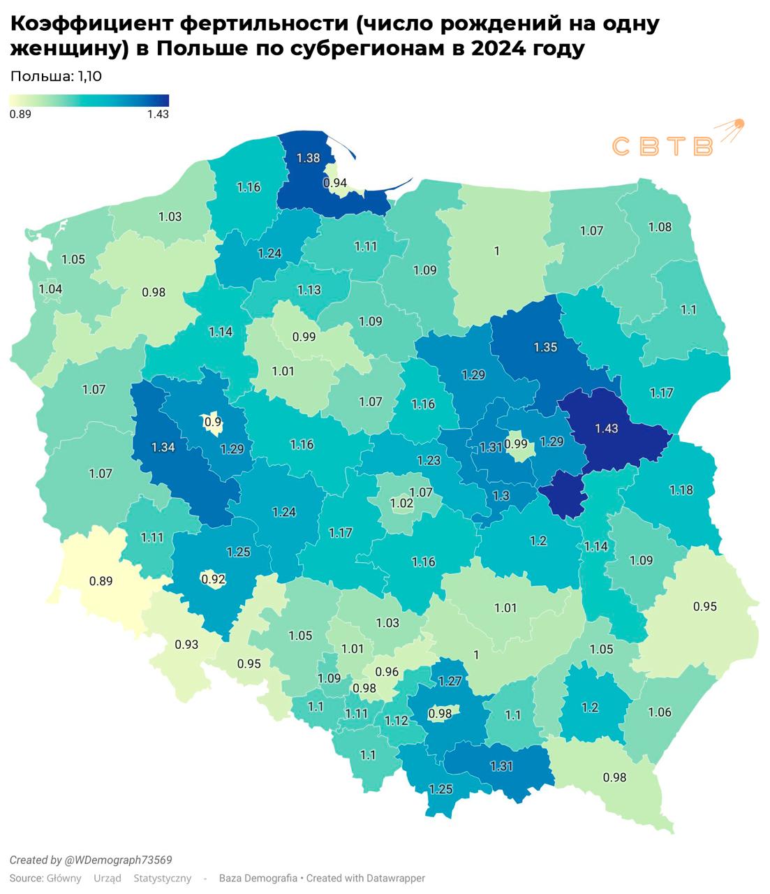 Согласно данным Главного статистического управления Польши, суммарный коэффициент рождаемости в Польше в 2024 году составил 1,099. Показатель стал самым низким в истории наблюдений.