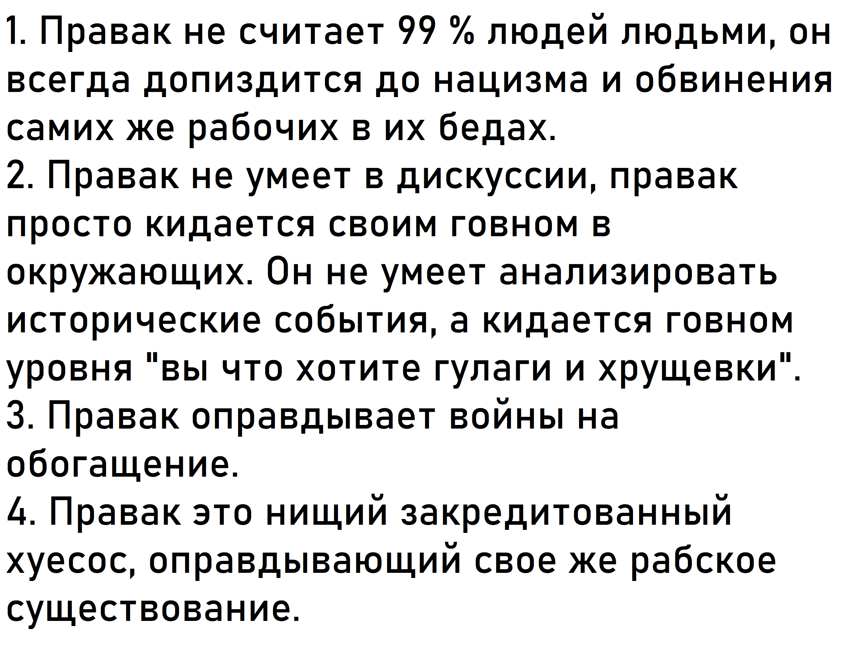 >>61507672 в каждой стране леваки находят повод погундеть. а теперь сравни леваков пидорахи (хохлов) и пиндостана. получишь полную противоположность. хотя теоретическая база у них одна. по факту же, ты предпочёл бы жить в фанерном сарае омахи, чем в вилле краснодарского края