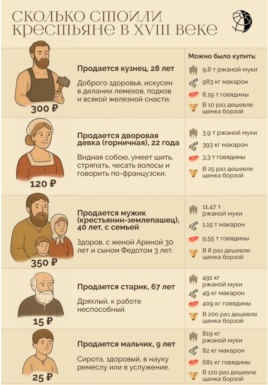 >>61570850 (OP) Что касается борзых, то в воспоминаниях о XVIII веке, опубликованных в журнале «Русская старина» в 1880-м говорилось: «Один помещик продавал девушек-невест по 25 рублей, другой в то же время покупал борзых щенков по 3 000 рублей. Стало быть, щенок, даже не собака, ценился в 120 раз дороже человека, или 120 девок равнялись одной суке».