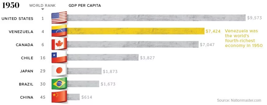 >>61614002 (OP) >Есть страны где всегда было много ресурсов, но были нищими >Интенсивная разработка нефтяных запасов привела к стремительному экономическому росту — в 1930—1970-х годах ВВП на душу населения в Венесуэле был на уровне западноевропейских стран, самый высокий в Латинской Америке