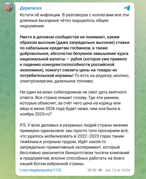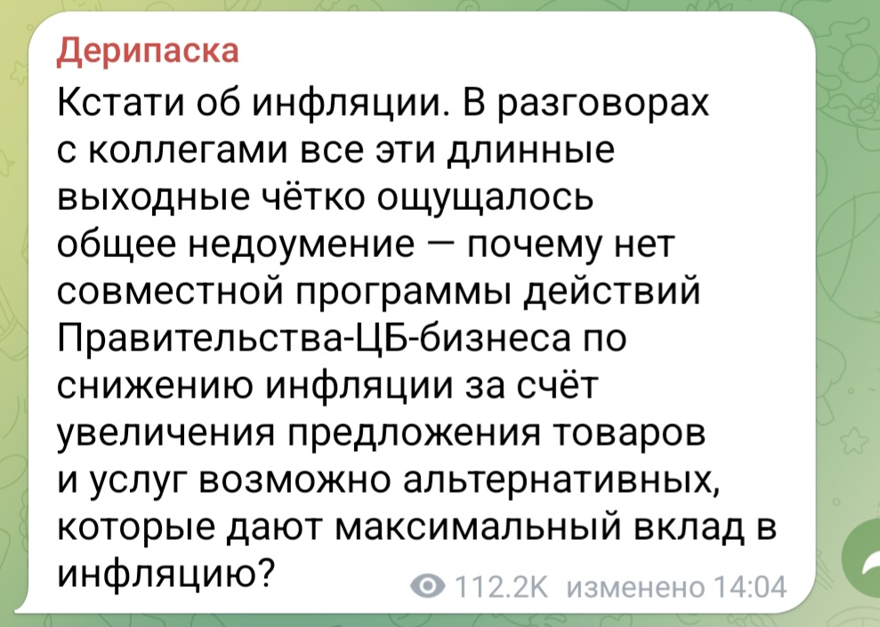 >>61628194 (OP) Дерипаска вроде в пидорашке работает всю жизнь, а так и не понял или прикидывается, что не понял, что высокая ставка нужна именно для того чтобы отрезать от кредита неприоритетные сектора экономики и перелить капиталец+рабсилу в приоритетные сектора, которые кредитуются льготно, а зачастую получают прямые транши из кубышек типа рфпи, домрф и от карманных нефте-газокабанов пыпы в обход нормальной процедуры кредитования.