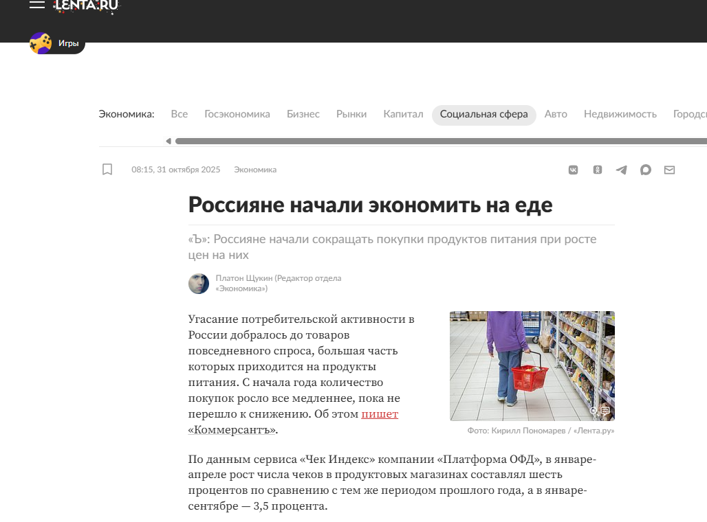 >>61628502 >Если проводить аналогию, то если человек зарабатывает 500к в месяц, а тратит 400к, то почему мы ожидаем, что он обанкротится? Потому что с 2014 года появилась тенденция, что некоторые привычные товары ПОЧЕМУ-ТО начали становится предметами роскоши. Достаточно почитать нытье в интернете: автомобили (сначала импортные, а теперь уже и жигули), потом видеокарты, потом брендовые тряпки, потом отпуск в Турции/Египте, потом импортное бухло и жрачка, теперь вот выясняется, что россияне почему-то начинают безо всяких аналогий экономить на еде.