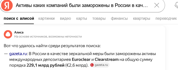 >>61637160 >>61636945 >>61636822 Хуй знает о чем вы спросите, когда богатеи просто договорились между собой. Европа заморозила активы РФ(на самом деле их вложила куда могла, они не просто где-то лежат и доход с активом распоряжается как хочет). В ответ РФ заморозила активы Европы и США на территории РФ примерно на ту же сумму, которые тоже не лежат, а вложены в бизнесы, промку, недвигу, прочее. Которые по дешёвки забирают богатеи РФ и получают с них профиты.