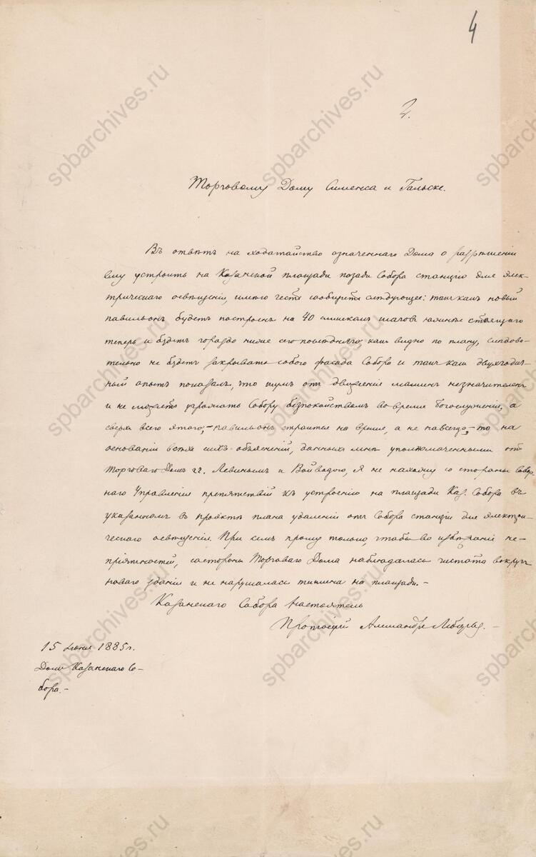 >>61643657 Да не было электричества тебе говорят! Сообщение настоятеля Казанского собора протоиерея Александра Лебедева Торговому дому «Сименс и Гальске» о согласии соборного управления на устройство электростанции за Казанским собором. 15 июня 1885 г.