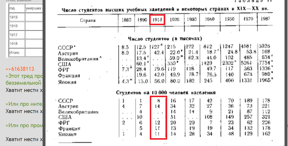 >>61636960 (OP) Этот тред про аграрную державу, где 80% населения крестьяне, но подушевой объём зерна в два раза меньше чем у безземельной Германии на 1913 год? Или про интеллектуальную империю, где уровень образования один из самых низких в Европе? Или про промышленную страну где уровень механизации с/х составлял 0.07%, когда как в США уже перевалил за 17%? Или про залы с юнкерами и французские булки, где средний уровень жизни был самым низким из всех Европейских держав? Или про великую страну где в среднем в деревнях ели 2-3 кг мяса в год, и ещё не ясно какого качества, и без учёта того что пока зажиточные ели больше этого, то беднота вообще его месяцами не видела? А в столичной Москве вообще аж 7 кг в год - сейчас на одну зп кассира Пятёрочки можно питаться в 2 раза богаче, чем высокооплачиваемые чиновники и учителя? Или страну где на человека-пахаря в богатый год выходил заработок в 6 рублей чистой прибыли, с которым хватало на хвалёный револьвер, но патроны видно нужно было уже на втором году покупать? Я же тебя по факту ещё в прошлом треде разложил на плесень и липовый мёд с выкладками и , а ты опять лезешь? 29 лет-с нyльчика-кун
