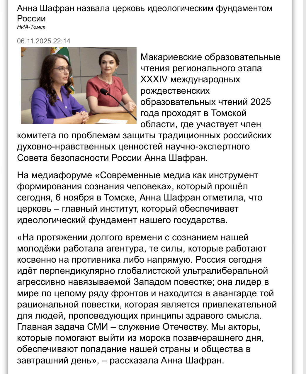 > Анна Шафран назвала церковь идеологическим фундаментом России