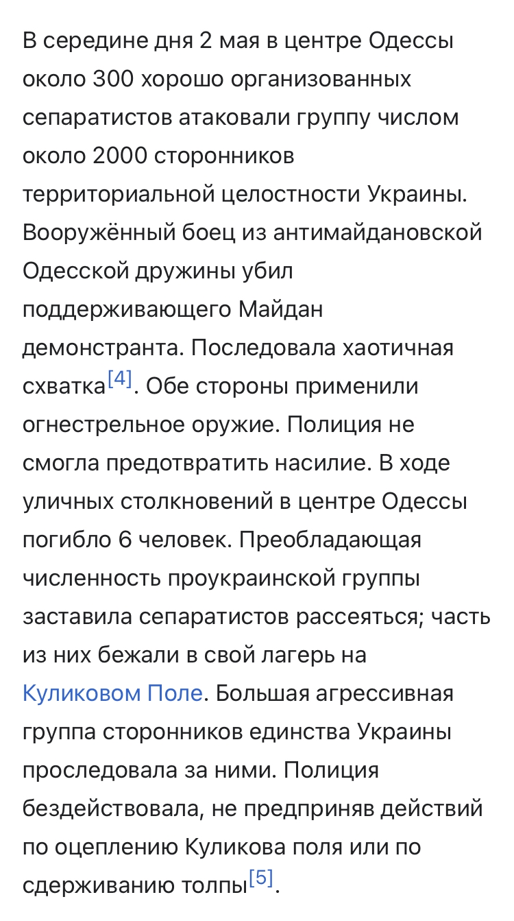 >>61641818 >выдавая одесские события за равную битву стенка на стенку, в которой пострадали обе стороны Тащемта, так оно в самом начале и было. Первыми оружие на митинг принесли именно антимайдановцы. Именно они атаковали первыми проукраинскую толпу. В ходе столкновений погибло несколько человек с обеих (!) сторон. Лишь затем, в ходе развития массовых беспорядков, антимайдановцы отступили и забаррикадировались в Доме Профсоюзов, и начали кидать с крыши коктейли Молотова — и толпа тоже начала кидать в них. Поэтому вердикт: виновна именно милиция, позволившая изначальным массовым беспорядкам перерасти в большое противостояние и крупный пожар. Это не было умышленное сжигание людей, это был результат массовых беспорядков, спровоцированных антимайдановцами.