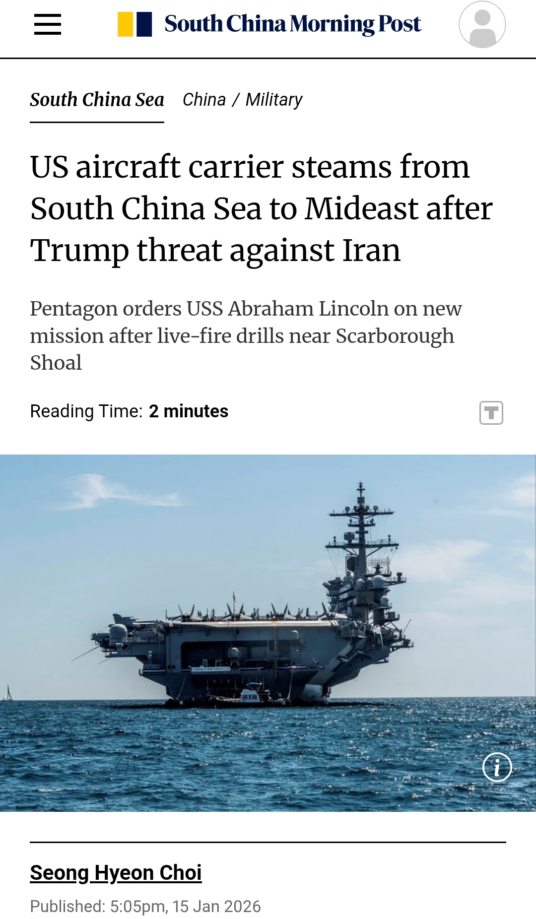 Согласно трекеру авианосцев Военно-морского института США, по состоянию на понедельник в зоне ответственности Центрального командования США (CENTCOM) не было развернуто ни одного американского авианосца. Abraham Lincoln находился ближе всего к региону из всех действующих авианосных ударных групп, выполняя операции в водах вблизи рифа Скарборо.