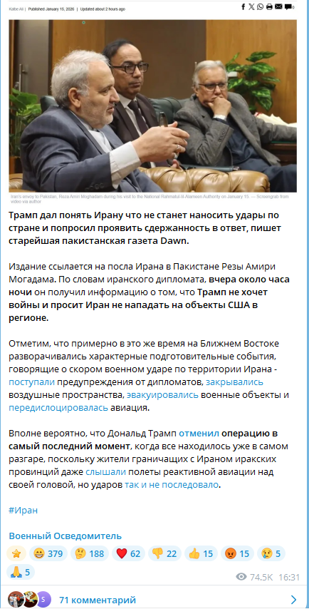 🔹 С другой стороны, советники Трампа предупредили его о неспособности США справиться с возможным крупномасштабным военным ответом со стороны Ирана.