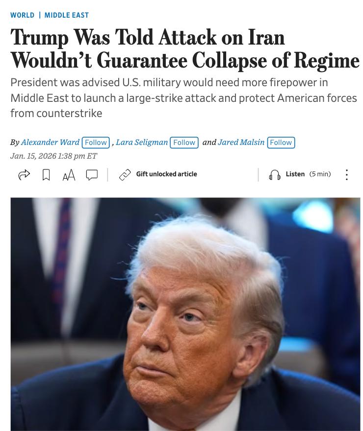 Трампу сообщили, что масштабный удар США по Ирану с малой вероятностью приведёт к падению режима и может спровоцировать более широкую войну, поэтому он выжидает, наблюдая за тем, как Тегеран будет справляться с протестами, прежде чем принимать решение.