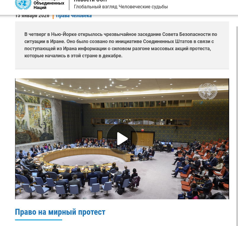 https://news.un.org/en/story/2026/01/1166769 >Совет Безопасности ООН проводит экстренное заседание в Нью-Йорке по Ирану на фоне растущей обеспокоенности по поводу сообщений о сотнях погибших во время общенациональных антиправительственных протестов, продолжавшихся несколько недель. Заседание было запрошено Соединенными Штатами, что подчеркивает неотложность кризиса. Демонстрации, начавшиеся в конце декабря и вызванные резким ростом инфляции, цен на продукты питания и обвалом национальной валюты, спровоцировали смертоносные и широкомасштабные репрессии, в результате которых тысячи людей получили ранения и были задержаны, согласно многочисленным свидетельствам очевидцев. ООН призвала к независимому расследованию всех убийств и предостерегла от возможного применения смертной казни в отношении протестующих. Еще и ООН подтянули. Балаболят, как не в себя.