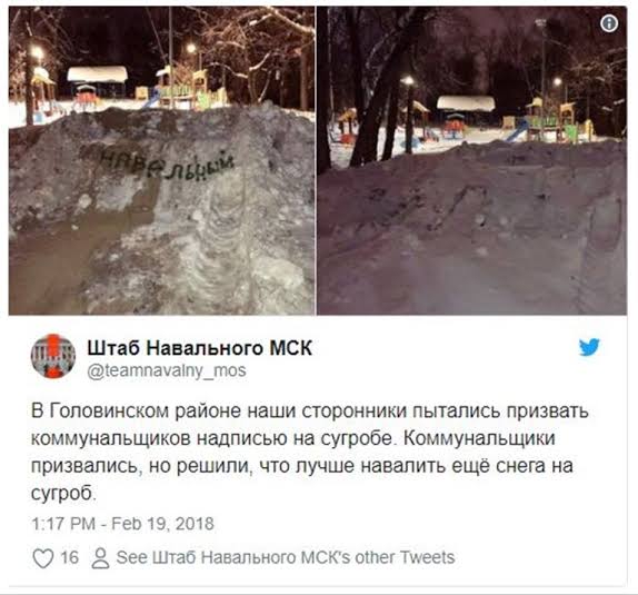 >>61662930 Я еще помню, как жильцы какого-то дома жаловались на огромный сугроб во дворе, мешавший проехать и пройти, сугроб все не убирали и не убирали по причине пошел нахуй, нет сырья и кадров. Жильцы написали на снегу "Навальный", на следующий же день мигом нашлись и сырье и кадры, снег мгновенно убрали.