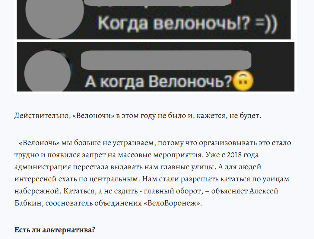>>61661733 (OP) >>61661818 В Воронеже раньше были велопарады в с 2013 по 2019 кажется. И вот как-то раз туда приехала Единая Россия со своими флажками, ну и после велопарада им в комментах там накидали любви. С тех пор велопарада в городе нет. А велопарад изначально был без политики + согласован со всеми и было сопровождение ДПС с перекрытием дорог. В общем было прикольно. Больше не будет. Они зону строят, режимный объект. Все запретить, нипущать
