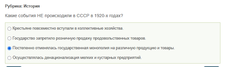 Первый ответ правдив, но так как тест составлен товарищами из КПК, то мне кажется, по их версии все обстояло иначе, а значит и в тесте тоже. Второе подходит к 20-ому году, так как при военном коммунизме такое вроде бы было. Третье произошло при НЭПе, но потом стали прикрывать к концу двадцатых. Четвертое, опять же, НЭП.