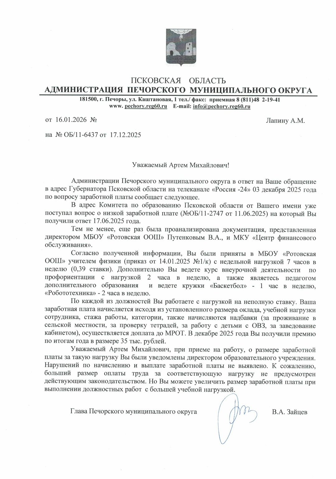 Псковский чиновник Зайцев предложил учителю с зарплатой 14 тысяч больше работать