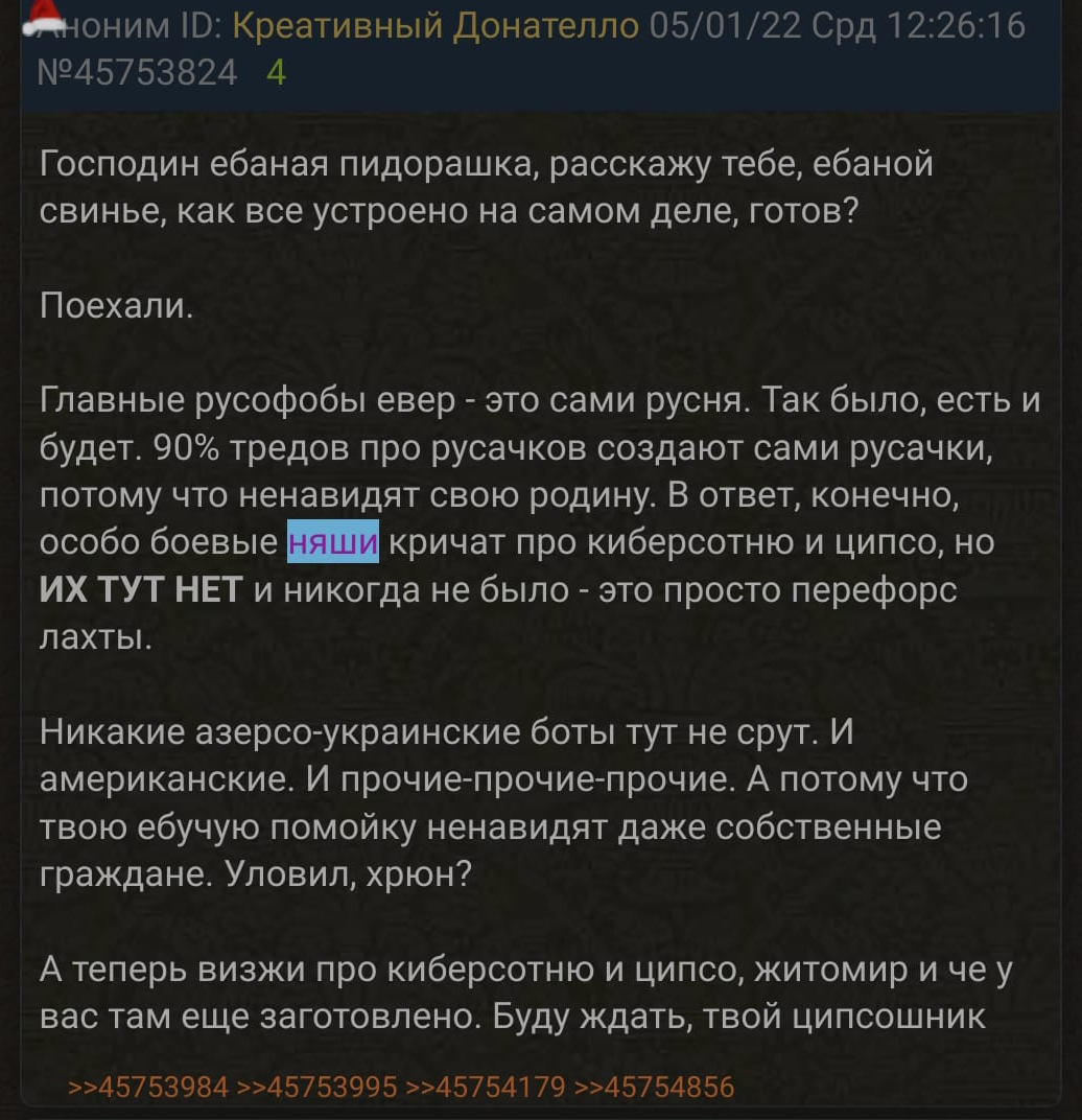 >>61726542 > 0% Ну это очень сильный манямирок. 90% постов в мартыхаче пишут русские ватные скуфы, 90% постов обр писали русские бурундуки. Над лахтой прикольно потешаться, но основной политсрач всегда был русские против русских. Думать что русские в принципе не пишут что-то подзалупное это уже уровень шизофрении. Впрочем по твоим постам и так понятно что ты с диагнозом, иначе ты бы не выписывал любого неприятного тебе постера из русских.