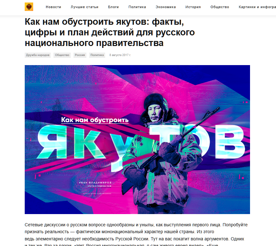 >>61730200 Нет, прочитай старую статью на СиПе, которую я приводил выше >>61724803 и видео посмотри. Или вспомни сколько раз националисты высасывали конфликт из пальца или выдумывали, раздували его на ровном месте. https://sputnikipogrom.com/russia/75734/rebuilding-sakha/ Но их главная мантра "проблемы индейцев/чужаков/врагов нашего белого шерифа не волнуют" - в этом вся суть и опасность национализма. Автор статьи выдумал, написав еще в 2017 году, что все уже, от якyтов сплошная угроза, у них там свой радикальный околобендеровский национализм, якобы их население там растет гигантскими темпами, они все плохие и отсталые, от них страна деградирует, между русскими и якyтами сплошная пропасть и конфликт. И дальше пишет: вот все отберем у них, отдадим москвичам и заживем. Также пишет, что нужно полностью уничтожить их идентичность, возможно даже запретить, мол это страна только для русских, это в интересах русских, а не то "везде сепаратисты, угрозы, везде конфликт, мы проигрываем каждый день пока не выигрываем". Также автор требует вернуть русским Беларусь, Украину и Балтию, там в намеках написано. Вот к чему ведет национализм. Что это, если не дикость и не жадность?