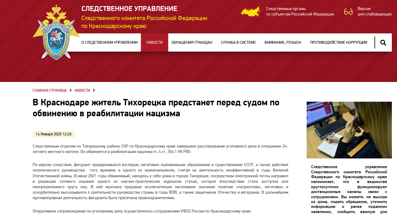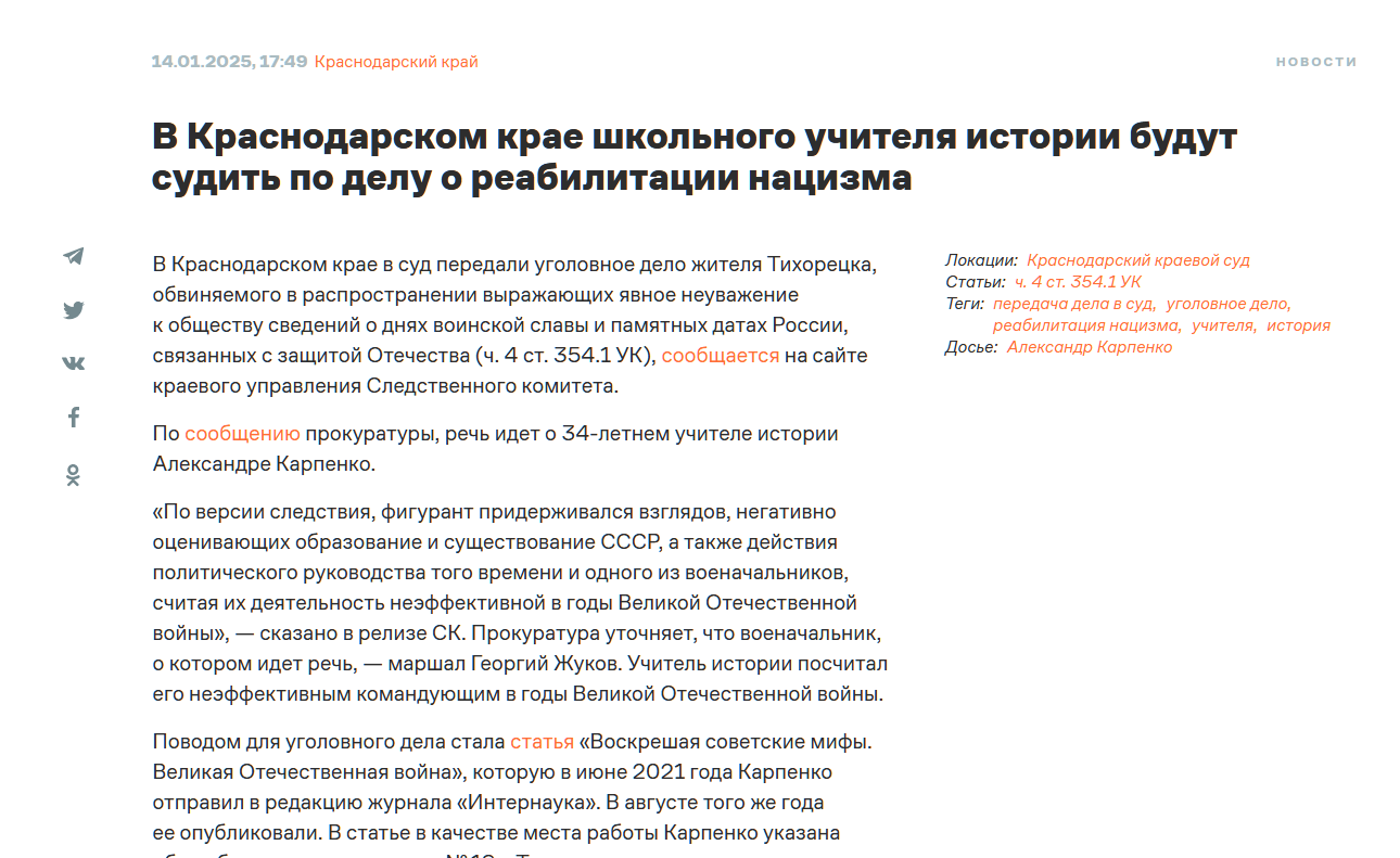 В Краснодарском крае школьного учителя истории будут судить по делу о реабилитации нацизма - 14.01.2025. Обвиняемый - Карпенко Александр Александрович, школьный учитель истории из Тихорецка. Причина обвинение - написание статьи для научного журнала, где автор критиковал и разбирал работу про историю Советского Союза. Автор писал, что во время сталинизма происходили страшные вещи, что военное руководство СССР не отличалось гениальностью, и что СССР также принимал в разделе Европы.