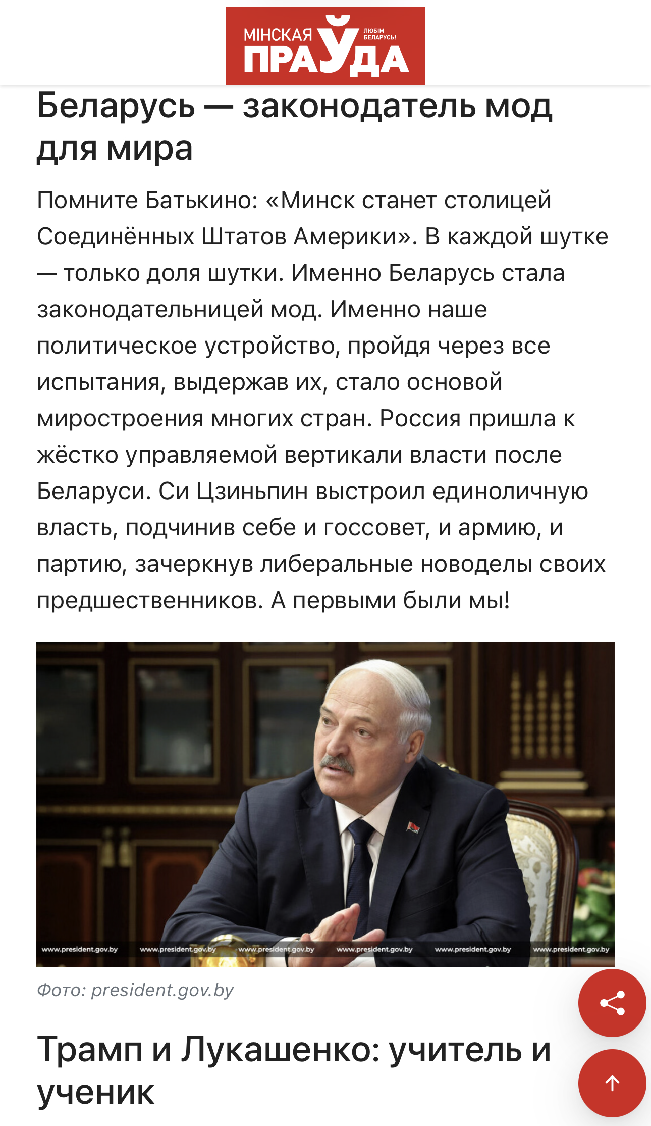 >Беларусь — законодатель мод для мира >Помните Батькино: «Минск станет столицей Соединённых Штатов Америки». В каждой шутке — только доля шутки. Именно Беларусь стала законодательницей мод. Именно наше политическое устройство, пройдя через все испытания, выдержав их, стало основой миростроения многих стран. Россия пришла к жёстко управляемой вертикали власти после Беларуси. Си Цзиньпин выстроил единоличную власть, подчинив себе и госсовет, и армию, и партию, зачеркнув либеральные новоделы своих предшественников. А первыми были мы! https://mlyn.by/23012026/belarus-vperedi-planety-azaryonok-uchit-trampa-upravlyat-stranoj/