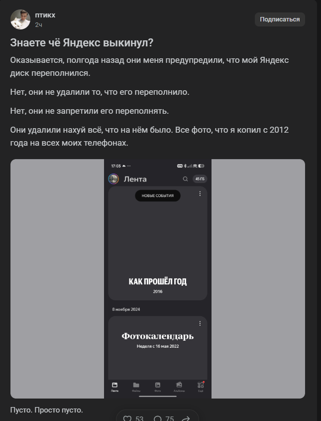>>61732934 (OP) Одновременно хочется и посочувствовать за потерю столь многолетнего набора личного контента, и в то же время сказать, что поделом ему за такую наивность - доверять облачным онлайн-хранилищам, которые управляются кабанами по другую сторону сетевого кабеля. Типичный дурачок. По умственному развитию такие люди недалеко ушли от тех, кто кричит, что "внешние жёсткие диски не нужны, всё всегда есть в интернете, то что попадает в сеть остаётся там навсегда".