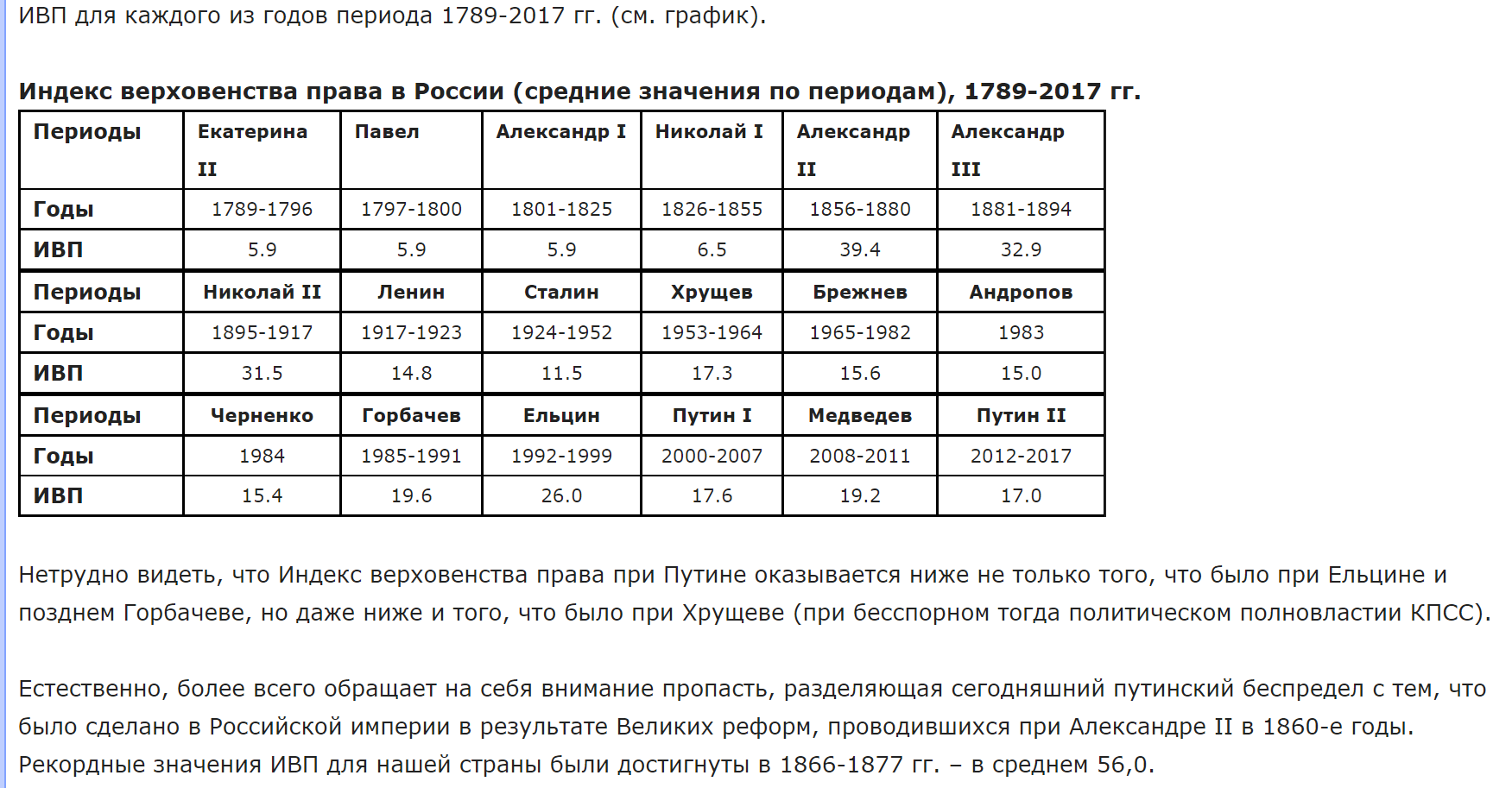 >>61735534 По ИВП в 1871 г. РИ занимала 24-е место из 62 государств мира. Без учета германских государств Бадена, Вюртемберга, Баварии, данные по которым включены в базу наравне со всей Германией, РИ занимала 21-е место из 59 государств. Значение ИВП в РИ было выше, чем, в частности, в Испании, Греции, Румынии, Сербии, Черногории, Коста-Рике, Уругвае, Колумбии, Бразилии, Мексики, на Кубе. По уровню верховенства права РИ находилась на границе между высокоразвитыми и среднеразвитыми государствами.