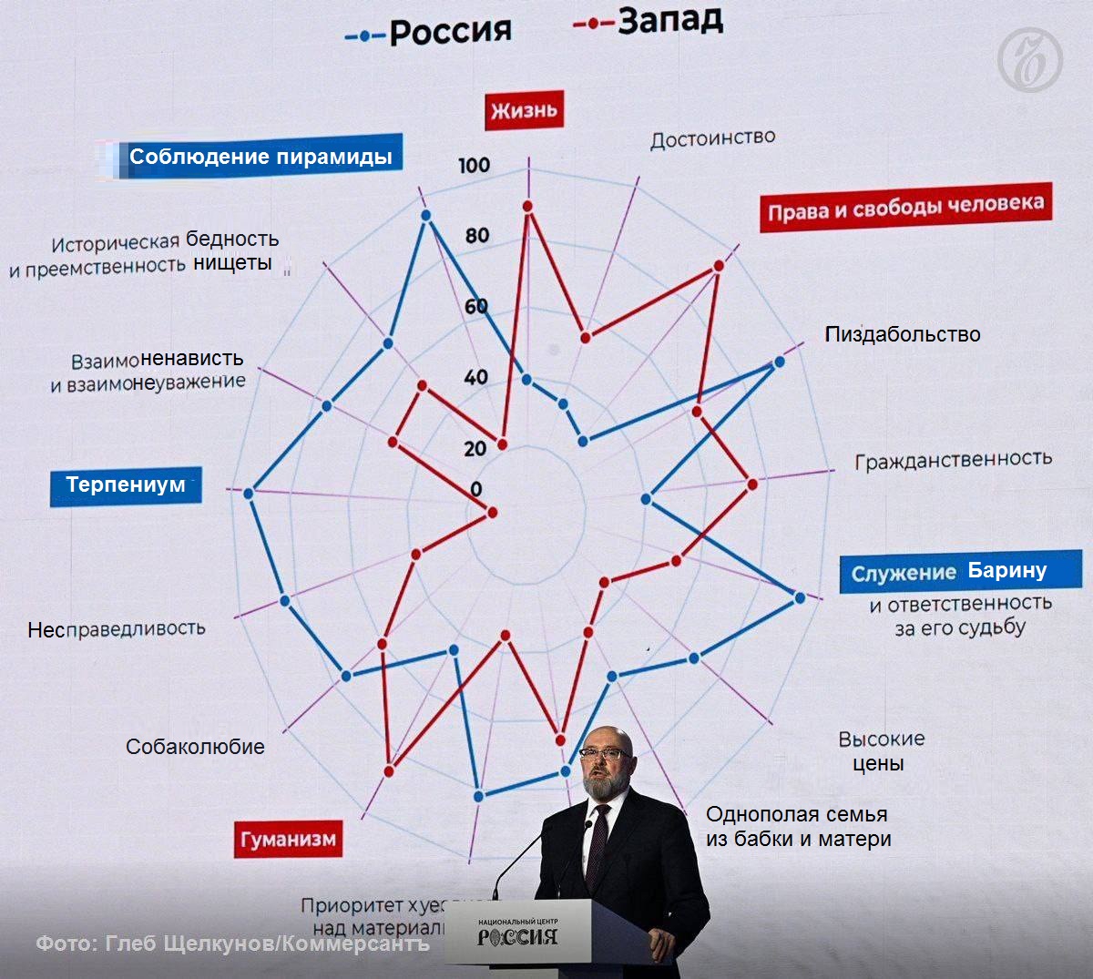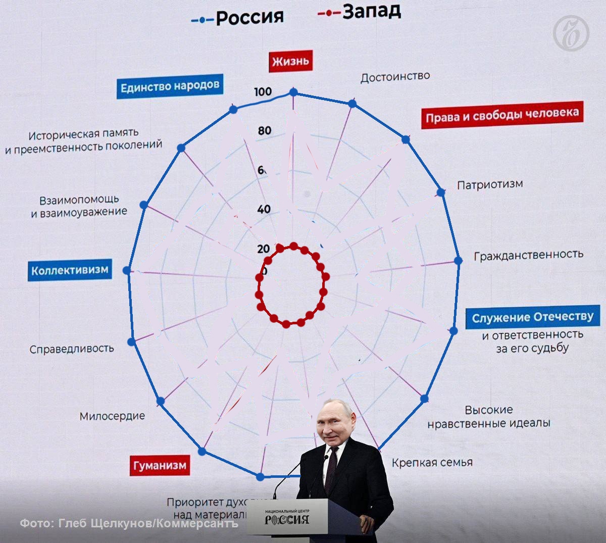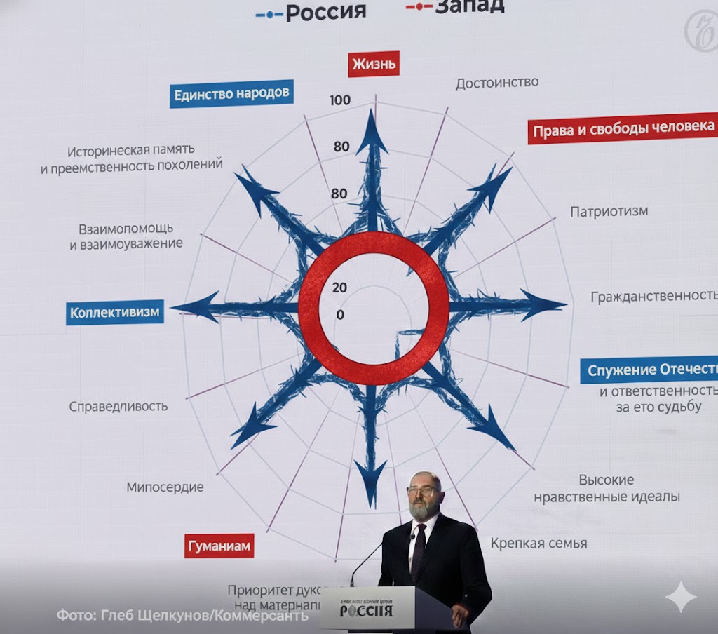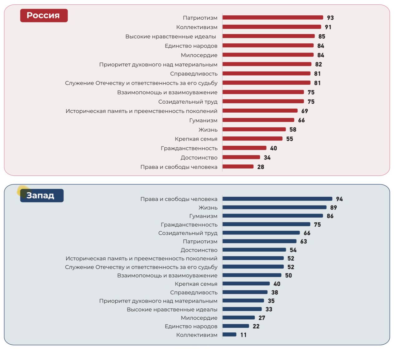 Коллективизм-лживая профанация,годам педалировали,каждый может быть лучше,а теперь мы все должны быть вместе Единство Народов распадётся быстро,поздний СССР и Югославия,Сирия тому в пример и не только они Служение отечеству-тоже звучит как шутка,особенно в эпоху победившего глобализма Высокие нравственные идеалы-да видим их часто Крепкая семья,как у президента в разводе? Приоритет духовного над материальным спецаильно выделили как достижение,чтобы люд не спрашивал за сверхдоходы и кумовство? Стремление к справедливости,с такой судебной системой............. Уж лучше Лига справедливости