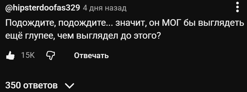 >>61741318 Он раньше (да и сейчас) называл себя центристом, но по факту просто склонялся в правую сторону, а теперь он просто магадебил (впрочем, вся партия республиканцев выродилась в них), окруживший себя такой же аудиторией и не умеющий читать дальше заголовка. Мне вообще его феномен популярности непонятен. Чел не является экспертом каким-то (только в области игры в WoW), не получал нормальное образование, не способен заниматься дебатами, но при этом он крайне популярен. Он даже не уровень местных обрыг или закрепных, не уровень Жмиля какого-нибудь. Все-таки Задорнов был в чем-то прав.