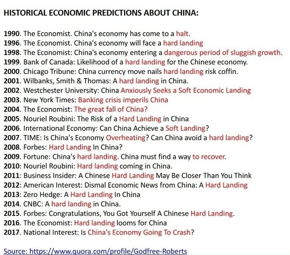 Аналог западных экономистов-политологов, которые с начала 90-ых каждый год предсказывали крах Китая.