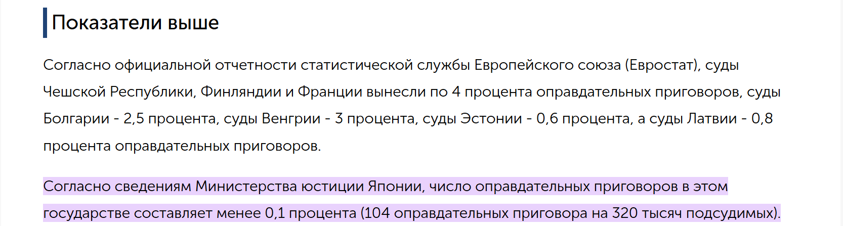 >>61744089 А можно передать те же цифры в сравнении с Россией. В Чехии, Финляндии и Франции, число оправдательных приговоров в 26 раз выше, чем в России. В Болгарии в 17 раз. В Венгрии в 20 раз. В Эстонии в 4 раза. В Латвии в 5,5 раз. В Японии на треть меньше.