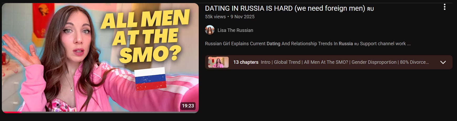 Вот у нее очевидно посредственное лицо, прям очень сильно. Буквально как у лошади, ещё и с гигантским носом. Вытягивают лишь глаза и макияж. И я представляю какая у нее там планочка, что аж такой ролик записала. Ну а теперь представьте какая планочка у симпатичных и тем более красивых. Тем более когда есть множество историй как какая-то баба нашла мужа иностранца, тут сразу мысль "а я что хуже?" + Ещё есть тема с шейхами и многие готовы быть пятой женой у них