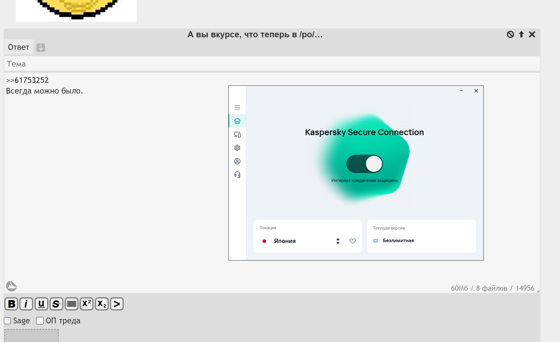 >>61753608 Кек, так значит по прежнему нельзя. То, что тебе касперыч делает маску из-под русского айпи - это значит что конкретно этот российский айпишник не заблокирован на пораше. Но большинство заблочено, поэтому хрен ты что здесь запостишь.