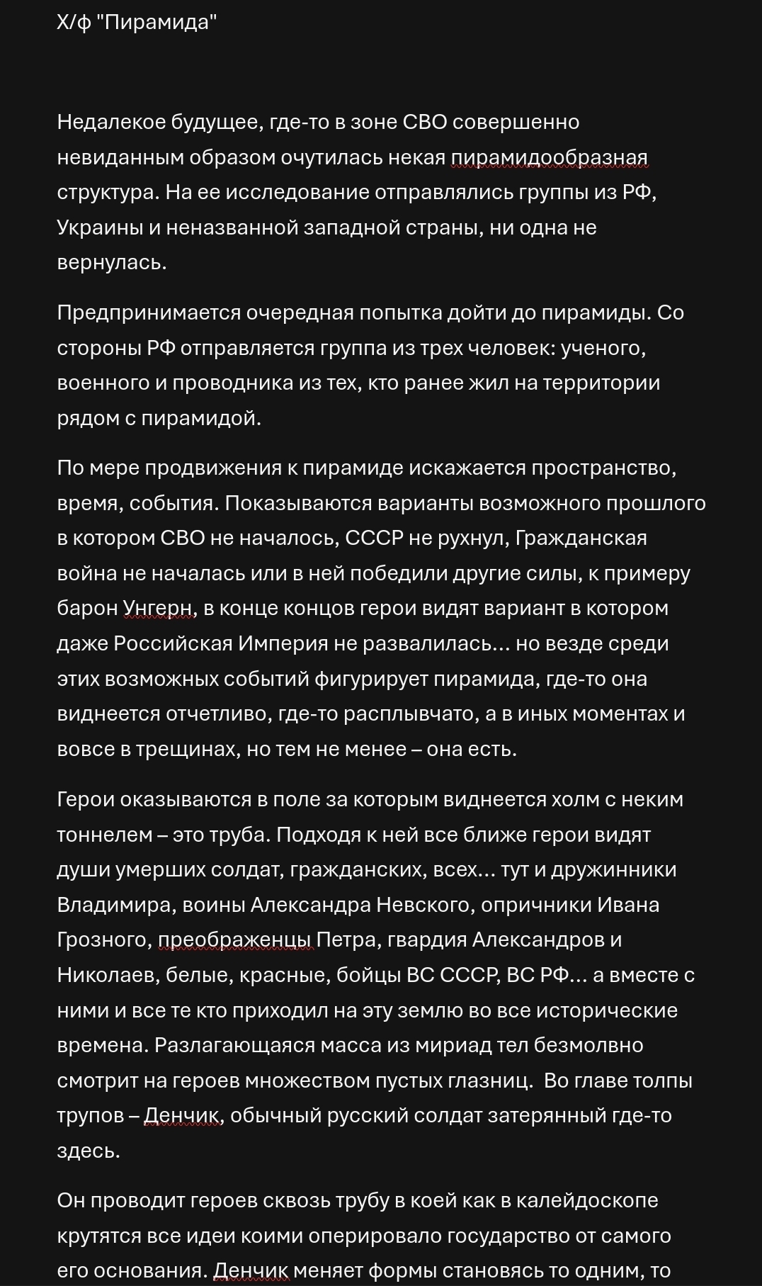 Сюжет: > Главный герой — вчерашний студент-историк, который всю жизнь играл в Сталкер и Metro. Его призывают в первый день СВО. > Вместо винтовки ему выдают лом с наклейкой «Made in China» и дают задание охранять старый сарай в Курской области. > Весь фильм (120 минут) мы смотрим на экран его старого Nokia, где он читает Двач, листает «ВКонтакте» и пытается заказать пиццу, но доставка не работает. > В сарае начинают происходить странные вещи. Сначала он находит там портрет Путина, который меняет выражение лица. Потом ему кажется, что ямы вокруг сарая сами себя роют. > В финале на него нападает вражеский дрон. Герой пытается его отбить ломом, как в видео с YouTube, но лом ломается. Дрон не убивает его, а сбрасывает листовку, где написано: «Это всё сон». > Камера отъезжает, мы видим, что герой вообще не в армии, а просто лежит в палатке-пингвине на олдфагах в лесу, и ему просто плохо от абсента.