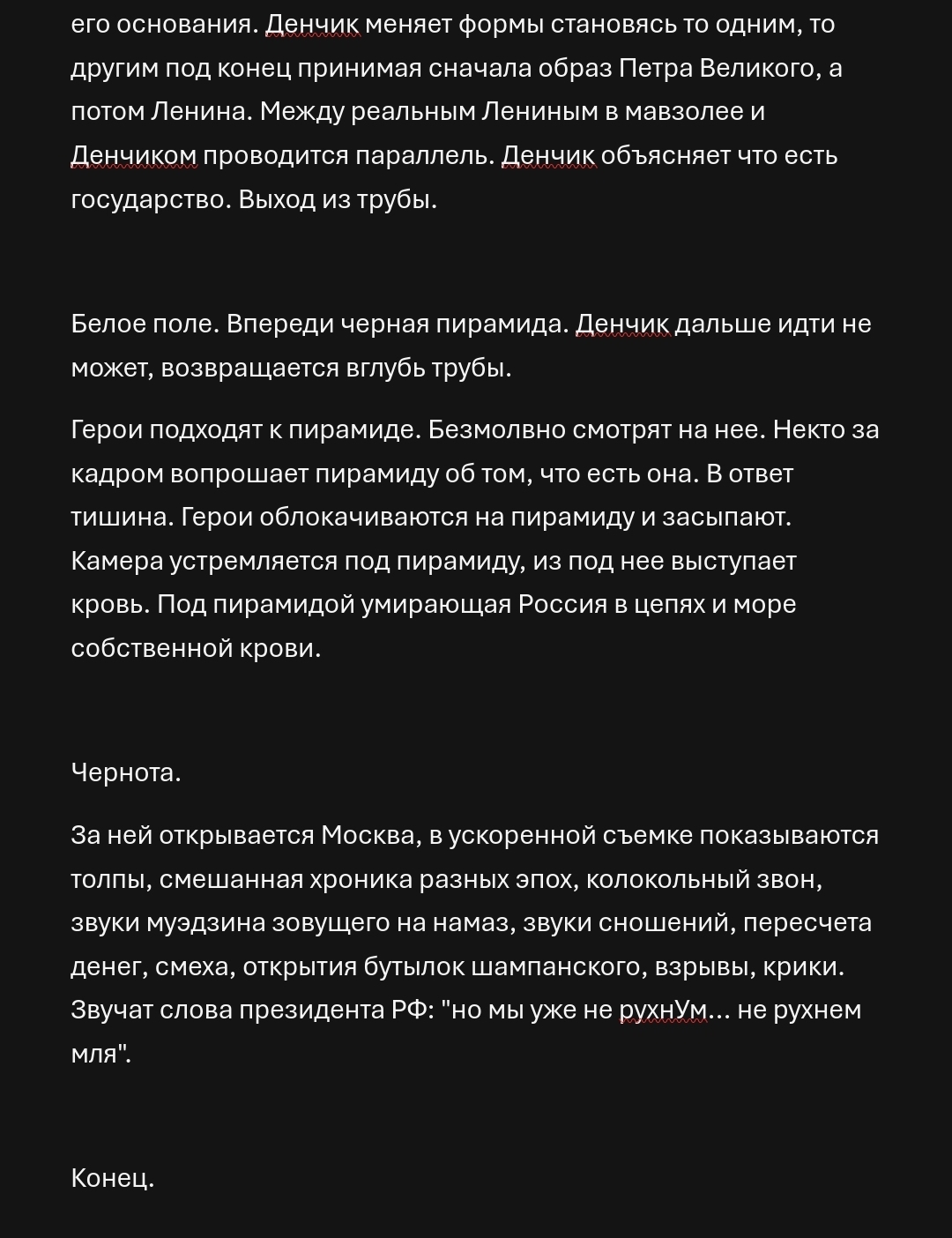 (устало) Я не хотел идти. Меня заставили. Сказали: "Вернешься героем". А теперь что? Тащу мертвеца, а дома, может, и ждать некому... Голос Денчика (из-под брезента, саркастично): Герой, говоришь? А я вот не герой. Я просто мясо. А ты — мой носильщик. Зачем тебе это? Брось меня и беги. Солдат (резко): Заткнись, Денчик. Приказ есть приказ. Кадр: Солдат ложится на землю, закрывает глаза. Камера показывает тело Денчика — из-под брезента торчит рука, которая медленно сжимается в кулак, как будто живая. Сцена 4. Труба. Смена дня и ночи. Кадр: Солдат тащит тело через огромную ржавую трубу, которая тянется через поле, как бесконечный туннель. Звук: Эхо шагов, капание воды, тиканье, как от часов. Визуальный эффект: Время ускоряется. Свет в трубе меняется — день сменяется ночью, ночь — днем. Солдат идет, не останавливаясь, его лицо становится все более изможденным. Голос Денчика (зловещий шепот): Мы здесь навечно, брат. Труба — это наш дом. Ты не выйдешь. Кадр: Солдат спотыкается, падает. Он смотрит на тело Денчика. Брезент сползает, открывая лицо — пустые глазницы и ухмылка. Солдат (кричит): Я дотащу тебя! Я должен! Он снова встает и тащит тело дальше. Камера показывает, как из трубы вытекает черная жижа, как будто сама земля гниет. Сцена 5. Финал пути. Потеря головы. Кадр: Солдат выходит из трубы. Перед ним — разрушенный город, серые руины. Он останавливается, тяжело дышит. Звук: Тишина, только звук его дыхания. Кадр: Солдат оборачивается на тело Денчика. Брезент сполз, и он видит, что головы нет. На месте шеи — рваная дыра. Солдат (в ужасе):